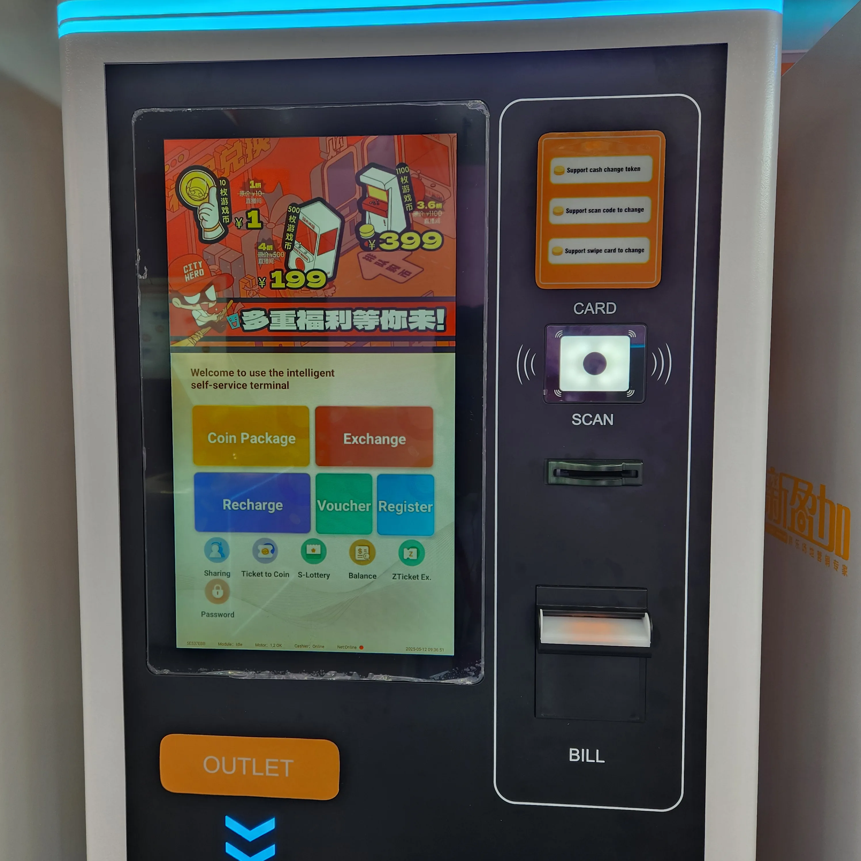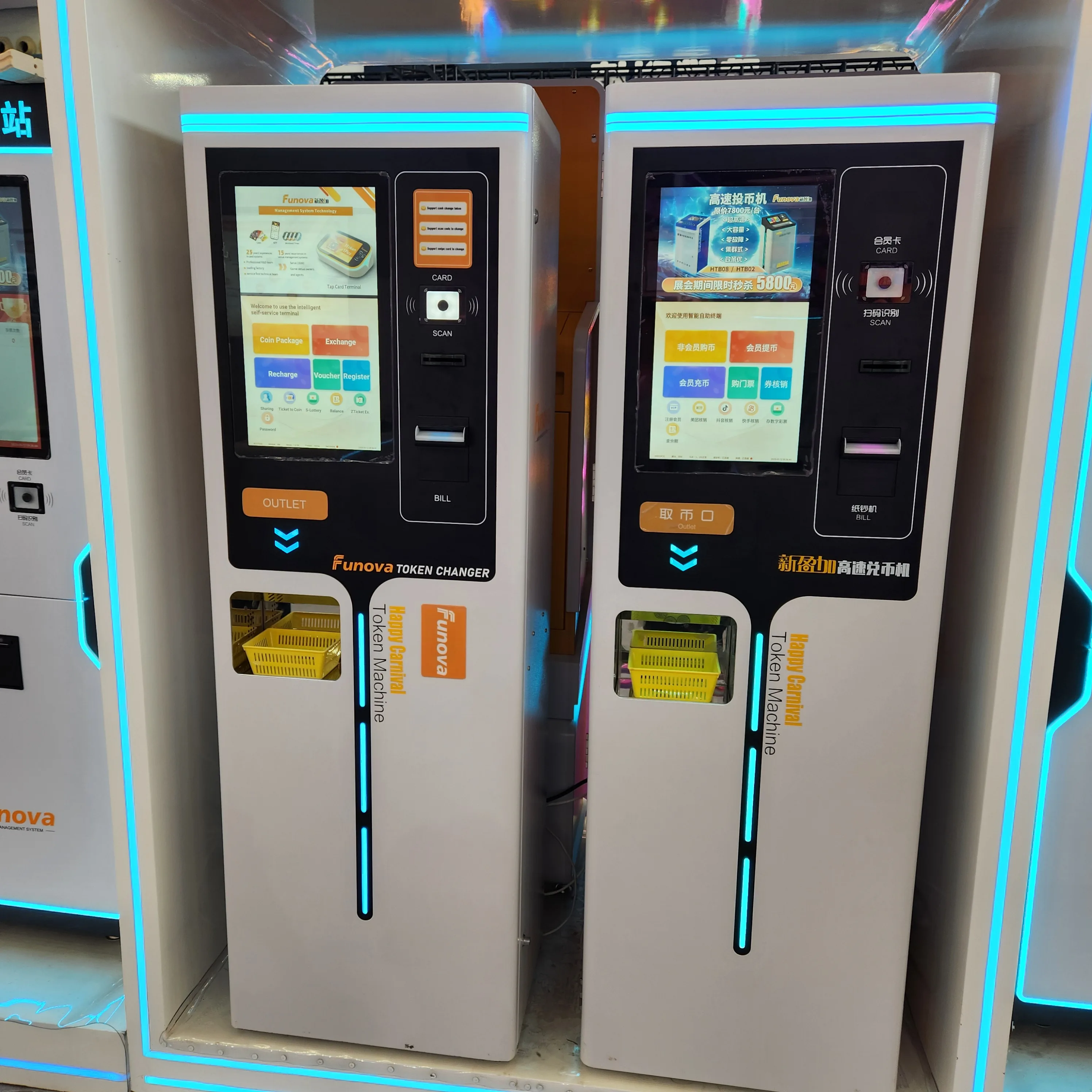 The Funova Coin Machine is also called token/coin vending machine.Within 18.5-inch touch screen, wireless WIFI connected, customers can operate many kinds of orders with their finger's touch on it. Mainly buying coins/tokens via POS machine, QR code scanner, cash slit, membership card reader, and other local payment method. What is D08 different from usual coin machines that is D08 has dual hopper that accurately counting and spitting coins twice fast. The coin capacity of safe box inside is about 30000, it alarms when takes unusual order or hit. The latest generation of D08 supports customers by themselves operate on touch screen to apply membership card for further entertainment.